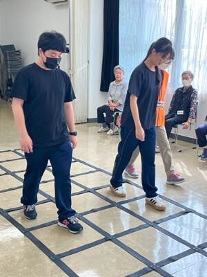 サポーターさんに教わりながらステップを踏む生徒達。難易度が上がると、手と足の動きがバラバラになったりフリーズしたり・・・。生徒達は「難しい~」といいながら、高齢者の方々に負けじと頑張っていました。