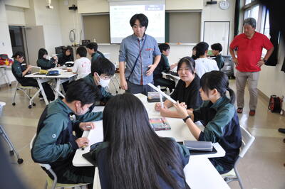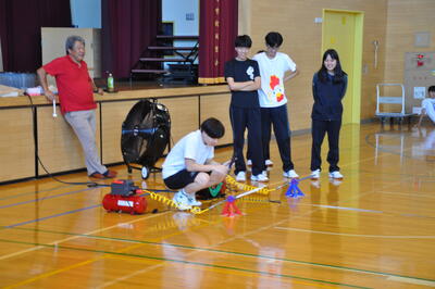 生徒たちは、チームワークの大切さを意識しつつ、計画を立ててモデルロケットを製作、打ち上げの結果から改善点を反映し、再製作することを繰り返す「エアロケットプロジェクト演習」に取り組み、状況変化時の適切な計画の修正、チーム内コミュニケーションを通じた柔軟な計画の運用などの理解を深めました。4つのグループに分かれて製作しましたが、どのグループも積極的で、楽しく取り組んでいました。大学の先生との意見交換も盛んでした。一番飛ばしたグループは、体育館の縦いっぱいの長さまでの距離が出ました。