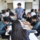 生徒は3~4人の小グループに分かれて、6社の中から第一希望を含む3社と20分程度の座談会をそれぞれ行いました。この日は気温が高く、講師の方も額に汗を流しながら生徒のために勤労観を語ってくださいました。生徒もメモを取りながら真剣に内容を聞き、質問をしている場面も見受けられました。