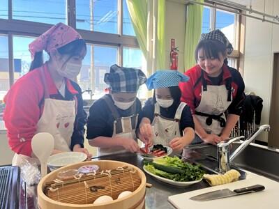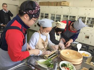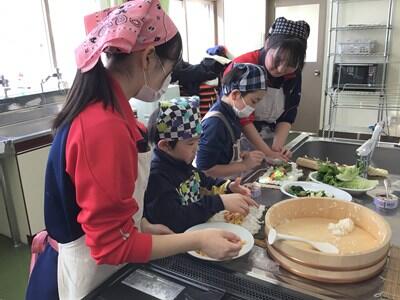 テーマを「食事と運動で寒さを吹き飛ばそう!」とし、前半は本校家庭科担当による「恵方巻き作り」、後半は保健体育科担当による「キンボール」を楽しみました。また、本校クッキング部の6名がアシスタントとして参加協力しました。