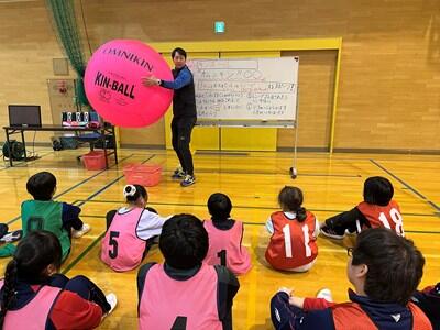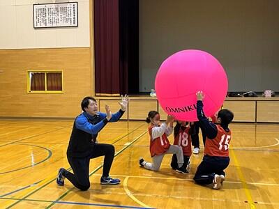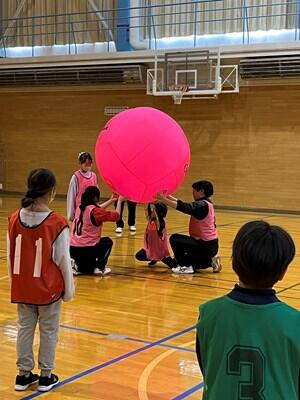 ニュースポーツ「キンボール」は、もちろんみんな初めての体験です。小学生にとっては自分の身長と変わらないほどの巨大なボールをヒット(打つ)してレシーブ(落とさないようにキャッチする)するスポーツです。ルールの説明をよく聞き、さっそくプレイ!