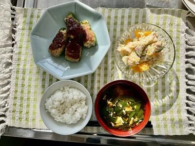 ▶ピーマンの肉詰め、カッテージチーズ入りポテトサラダ、ニラと卵のスープ