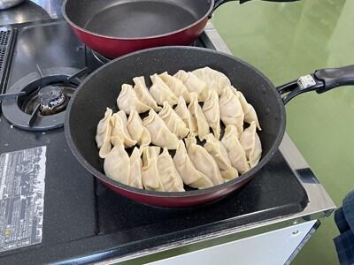 みんなで協力して具を包んでいるところです。「ひだが寄らな~い!」と苦戦してました。