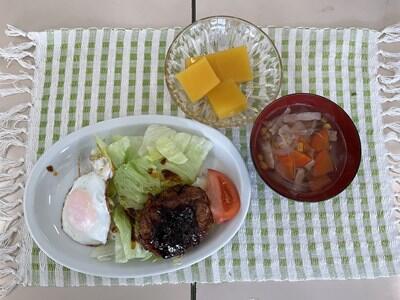 ▶ロコモコ丼、コンソメスープ、オレンジ寒天