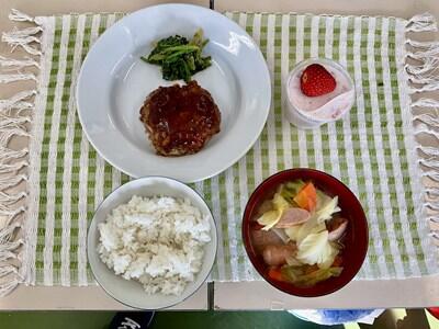 ▶デミグラスハンバーグ、ほうれん草のごま和え、コンソメスープ、いちごのパンナコッタ