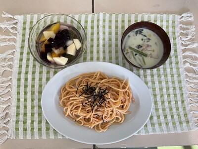 ▶和風たらこパスタ、きのことほうれん草のミルクスープ、フルーツパンチ