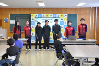1月24日に、日本宇宙少年団大樹分団主催でエアロケット製作と打ち上げ実験の活動を本校体育館で行いました。当日は、小学生6名(及びその保護者等)が参加し、本校の航空宇宙ボランティアサークル1・2年生のメンバー7名も製作アドバイザーとして参加しました。本校生徒は、今年度、和歌山大・慶応義塾大との連携授業や理科の授業等で、製作経験があったので、小学生に遠くへ飛ばすためのヒントを与えながら、小学生それぞれが製作する様子を温かく見守ったり、発射実験に付き添ったりなどしました。