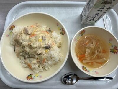 本日の給食です。「野菜たっぷりドリア」「コンソメスープ」
